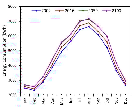The simulated annual energy consumption for years 2002, 2016, 2050, and 2100 are compared in Figure 7 to assess climate change impacts. The results illustrate increasing energy demands over time, with significantly higher consumption occurring during summer months as cooling loads intensify under warmer conditions. By 2100, the annual electricity usage rises to 114,000 kWh, approximately 22% above the 2002 baseline. The maximum monthly peaks escalate from around 9500 kWh in 2002 to over 12,000 kWh in 2100, a 26% increase. These projections align with literature estimating 15–25% rises in Persian Gulf region building cooling demands by 2100 resulting from climate change [52,69,70]. The considerable intensification of summer peaks highlights the vulnerability of Qatar’s residential sector to rising temperatures.