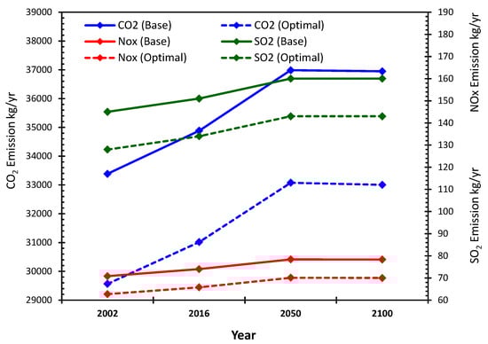 The findings highlight that for all years, a grid-connected system without battery storage consistently emerges as the least cost-optimum for all years. This reflects the significant capital costs of batteries, which increase net present costs despite offering backup capabilities. The optimal PV array capacity scales up moderately over time, from 7.4 kW in 2002 to 8.2 kW in 2100. This 23% increase compensates for growing cooling demands resulting from climate change. The additional capacity helps maintain solar energy penetration rates. However, the renewable fraction declines slightly over time, from 18% in 2002 to 16% in 2100. Thus, while PV capacity scales up moderately, the solar energy contribution declines slightly relative to the total load. This indicates efficiency reductions associated with higher temperatures diminishing PV output as climate change progresses [32,33,34,35,36]. Qatar’s peak summertime temperatures exceeding 50 °C can degrade PV yields over 15% compared to standard test conditions. Overall, the techno-economic optimization verifies rooftop solar PV as a cost-effective measure for Qatar’s residential buildings, even with rising cooling load. The grid-connected system minimizes households’ life cycle costs, while reducing emissions intensity compared to grid-only electricity. Climate change does gradually erode solar performance and self-sufficiency potential. But the PV adoption remains financially viable with simple payback periods below 8 years for all cases.