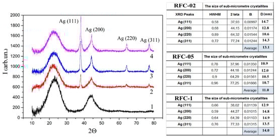 XRD patterns of nanocomposites: RFC (1), RFC-02 (2), RFC-05 (3) and RFC-1 (4) with deconvolution of diffraction peaks of Ag nanophase and calculated size of crystallites.