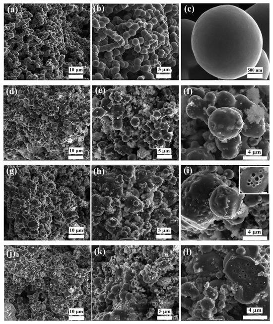 It is noteworthy that the size distribution of the spheres becomes more heterogeneous with increasing silver salt content (Figure 3d–l). Numerous spheres measuring 1 μm in size appear. In our studies, the amino groups from the ammonia solution play an important role in the formation of polymer spheres and consequently carbon spheres after pyrolysis. NH4+ not only accelerates the RF polymerization process, but also ensures the accumulation of positive charges on the outer surface of the polymer spheres, which prevents their aggregation and reduces the size of the carbon spheres [41,42]. The volume of ammonia solution used in the synthesis to form Ag(NH3)2+ complexes is the largest for the RFC-1 sample; therefore, the number of spheres with the smallest size is the largest here.