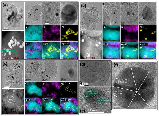 According to the TEM analysis, Ag nanoparticles exhibit a spherical morphology and are distributed in the carbon phase (Figure 4). During pyrolysis, the majority of single-crystalline nanoparticles of cubic Ag with a diameter ranging between 3–15 nm have penetrated (migrated) into the carbon spheres and are uniformly distributed in the sample (Figure 4). The distance between the planes of the lattice fringes is about 0.235 and 0.202 nm, which corresponds to the (111) and (002) planes of metallic silver [43]. There is such a dependence that with an increase in the content of modifier, the number of small silver nanoparticles (3–8 nm) uniformly distributed in the carbon matrix increases (Figure 4d). This, in turn, may affect biocidal activity, which will be discussed in the next section. In addition, all composites contain nanoparticles consisting of multiple fused nanoparticles with twin planes {111} with diameters up to 18 nm. The most common is the pentagonal fusion (fivefold twinned) with the common axis of the zone (110) (Figure 4f) [44]. The formation of such NPs may be a consequence of Ag agglomeration due to the accumulation of smaller spherical NPs during heat treatment. However, in the sample with the highest content of modifier (RFC-1), particles with sizes ranging up to 50 nm are found. It is noteworthy that silver nanoparticles are also visible on a carbon shell, although they are mainly distributed in the silica matrix (Figure 4b). Moreover, part of the silica phase is located not only inside the carbon spheres, but also on their outer surface.