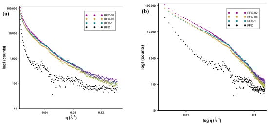 The structural properties of the nanocomposite materials can be determined using structure-dependent methods such as small-angle X-ray scattering (SAXS). In this way, the study of structural and interfacial properties can be performed for functional hybrid materials showing phase heterogeneity. Figure 5 presents the scattering data (the intensity versus momentum transfer q) in the form of log-linear and log-log plots. The SAXS profiles indicate the lack of structural ordering involving both the metallic phase and the micro-structure of the carriers. Some differences in the scattering profiles in the initial region of the SAXS curves (i.e., in the nanometric sizes of the scattering objects) were noticed. These features concern the scattering intensity and general shape of the scattering curves (especially for unmodified RCF sample) and illustrate the direct consequence of changes in the microstructure and morphology of the scattering objects. Based on the SAXS data, a number of structural parameters were determined. The summary of the calculated SAXS parameters can be found in Table 2.