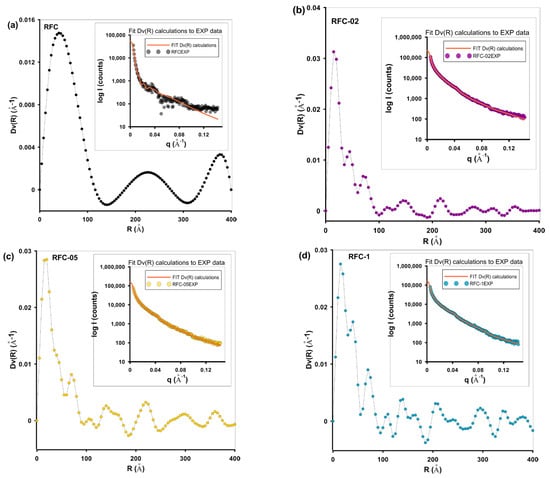 Particle size distribution by volume analysis for the RFC (a), RFC-02 (b), RFC-05 (c), and RFC-1 (d) samples with corresponding fit curves of Dv(R) calculations (solid lines) for the experimental data (points).