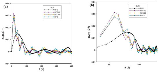 The size of the scattering objects (spherical particles) was analyzed by calculations of the volume-weighted particle size distribution Dv(R) function (Figure 6 and Figure 7). The scattering objects with spherical morphology (satisfying the probable assumption of a spherical shape according to the best fit of the theoretical curve) have sizes of 5.2, 1.8, 1.9 nm, and 1.7/4.0 nm (bimodal distribution) for the RFC, RFC-02, RFC-05, and RFC-1 samples, respectively.