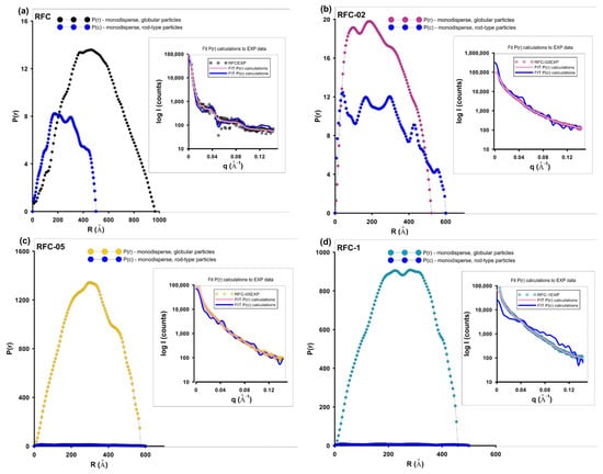 The PDDF functions with corresponding fitting analysis (as insets) for the RFC (a), RFC-02 (b), RFC-05 (c), and RFC-1 (d) samples. Calculations were performed for monodispersing globular and rod-type particles.