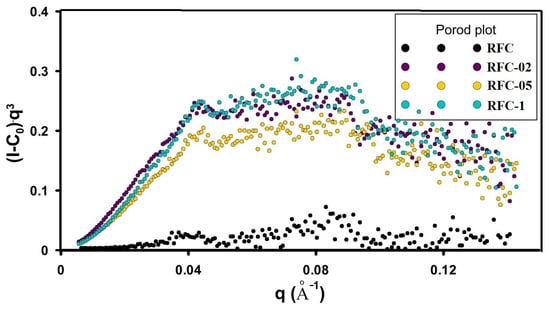Figure 9 shows the Porod plot determined for the investigated samples. In all cases, due to the variations and discrepancies in the unambiguous definition of the Porod curve and the Porod constant values, there are some diffuse boundaries or disturbances in the boundary regions. Therefore, their pseudo-asymptotic shape was defined in the high range of the scattering curves. The negative deviation from Porod’s law demonstrated the existence of an interfacial layer between the phases. Furthermore, a relative comparison of the birth curves may indicate that the interface is largest for the sample with the highest I·q3.
