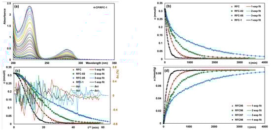 Example of a series of UV absorption spectra used for adsorption kinetics analysis (4CP/RFC-1 system) (a), and comparison of adsorption kinetics for 4-CP on carbon nanocomposites at coordinates: concentration—time (b), concentration—square root of time (c), and adsorption—time (d). The lines correspond to the fitted m-exponential equation.