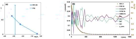 Distribution of rate coefficient ki, for adsorption of 4-CP on RFC-05 (a). Comparison of fitting quality by using the FOE, m-exponential, f-FOE, and f-MOE equations for the adsorption kinetic data for 4-CP on carbon nanocomposite RFC-1 (b).