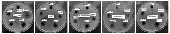 Muller–Hinton Agar MHA plates were inoculated with suspensions of the tested strains at a density of 1.5 × 108 CFU/mL 0.5 McFarland. An 8 mm diameter hole was then punched with a sterile cork-borer and 10 mg of the tested samples (RFC, RFC-02, RFC-05, and RFC-1) were applied. Silver nanoparticle stock solution (40 mg/L) in doses of 2 g and reference antibiotic cefepime—4th generation cephalosporin (disc 30 µg) were used as positive control. After 18 h of incubation at 37 °C, the zones of bacterial growth inhibition were measured. All experiments were performed in triplicate.