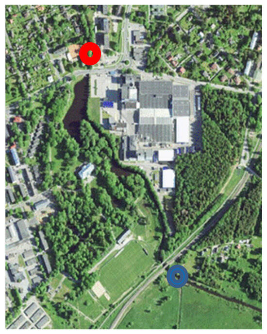 Map of sampling locations indicated by rings: before (blue) and after (red) the factory. Base map data: Estonian Land Board 2023 (https://maaamet.ee/en/spatial-data-and-maps/, accessed on 14 June 2023).