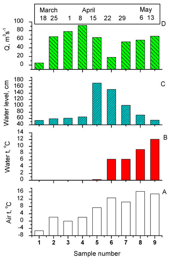 Hydrological parameters, sampling dates, and numbering for River Vääna water samples: (A) air temperature, (B) water temperature, (C) water level, (D) discharge (Q).