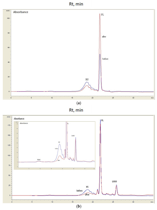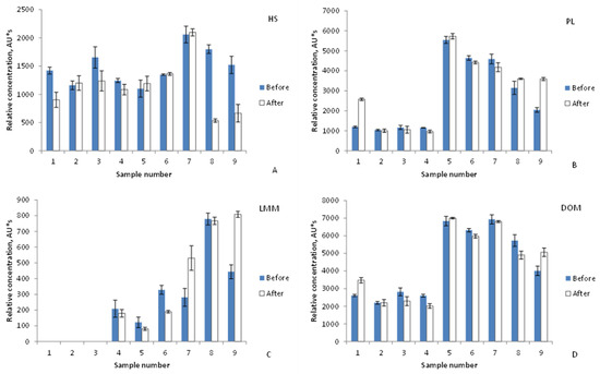 In order to evaluate the quality of the water of River Vääna and to reveal the possible site-specific effects, water was sampled at two locations 1 km apart, separated by a small pond and named before and after. There is an inflow of purified wastewater from a nearby factory to the pond. In the case of natural changes in the DOM caused by seasonal climate conditions, the chromatograms should look similar. Figure 3a shows two overlayed chromatograms of sample No. 1 from March before and after the factory. Generally, the DOM was separated into HMM, HS, PL, and LMM fractions. However, HMM and LMM fractions were missing from the early spring samples.