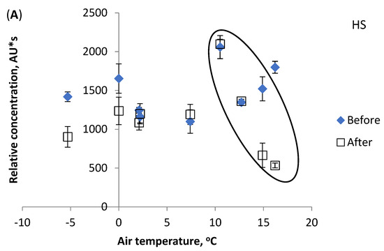 The present study indicates that the LMM fraction is the most influenced by water temperature increases. Figure 4C shows different values for the LMM fraction concentration. In chromatograms of samples Nos. 1–3, this fraction is non-existent. Thereafter, samples Nos. 4, 5, and 8 show statistically similar concentrations before and after the factory. Thus, the results refer to the natural origin of the LMM compounds found in the river water and not man-made pollution, except for samples 7 and 9. Figure 5 shows the effect of the air temperature on the relative contents of the DOM components HS (a), PL (b), and LMM (c). Air and water temperatures from under 0 to +7 °C, and from 0 to +6 °C, respectively, had no influence on DOM component concentrations. However, at higher temperatures, the PL components contents decreased (dependence on water temperature is strong, correlation coefficient R2 0.998). Figure 5B shows the change (decreasing PL fraction contents are surrounded by ellipse). The decrease in the PL fraction can be attributed to rising microbial activity, as in the case of River Pirita [15]. Possibly, the purified wastewater inflow caused decreased concentrations of HS components after the factory (circled), since the opposite trend is evident for samples before it (Figure 5A). The LMM fraction content continuously increased with rises in air temperature (Figure 5C), similarly to water temperature. The obtained results indicate that temperature changes might not be the only reason for changes in DOM components, and that anthropogenic factors must be considered as well.