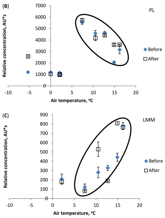 Effect of air temperature on relative concentration (peak area) of DOM components: (A) HS, (B) PL, (C) LMM. Vertical bars indicate confidence interval at ±95% level.
