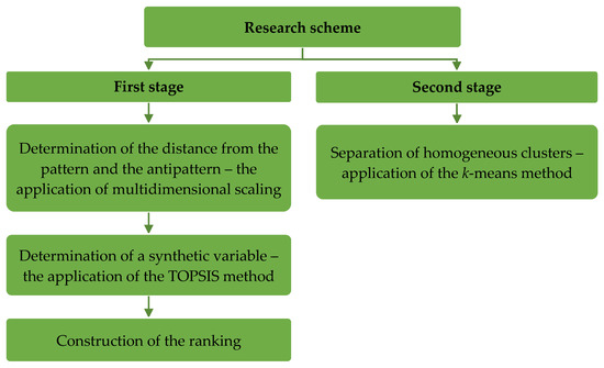 The study was carried out in two stages, as shown in Figure 1. The first step was to use multidimensional scaling to determine the distance between the pattern and the antipattern. Next, the composite variable was constructed using the multidimensional scaling and TOPSIS methods. This allowed us to build a ranking of the EU countries with respect to the well-being-related living conditions of elderly people. In the second stage of the analysis, we distinguished the homogeneous clusters of countries in terms of the well-being-related living conditions of elderly people by using the k-means method. Calculations were performed in the language R [66] with the use of libraries: clusterSim [67], ggforce [68], ggplot2 [69], ggrepel [70], grid [66], NbClust [71], plotrix [72], rworldmap [73], and stats [66].