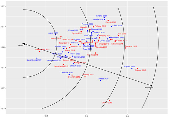 Also, hypothesis H2 was confirmed by means of multidimensional scaling. The distances between the well-developed Western European countries were quite small, and this group of countries was close to the pattern. Also, the distances between the new (after 2004) member states were quite small, and these countries were located further from the pattern. However, they were also quite far from the antipattern—the location of which was mostly influenced by the two worst countries (Bulgaria and Greece).