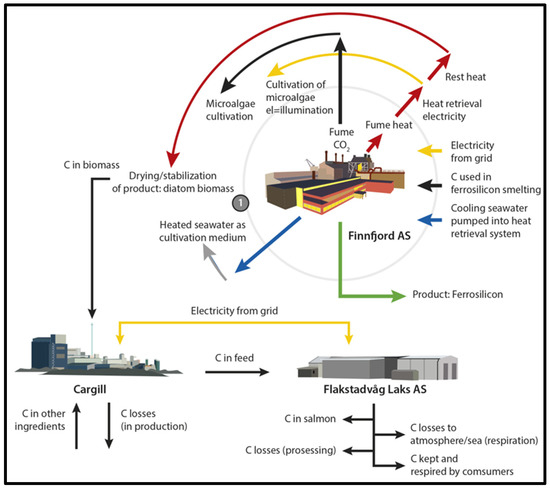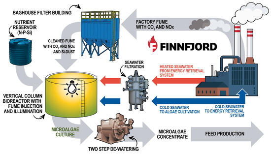 The project has a high degree of reuse of resources and energy in the cultivation process. The CO2 taken up by the microalgae (diatoms) is from the factory fume, and the cultivation medium is seawater already used (and heated if necessary) as cooling water in the energy recovery system (ERG), while the electricity used in the production process (artificial illumination, pumps, etc.) is from fume heat that drives the ERG system (Figure 2). Further, the biomass can be dried by rest heat from the fume. The product (algae biomass) in the present pilot project is, e.g., used (and tested) as an ingredient in salmon feed (Figure 2). Important here is also the short distance between the production of algae biomass and salmon aquaculture facilities.