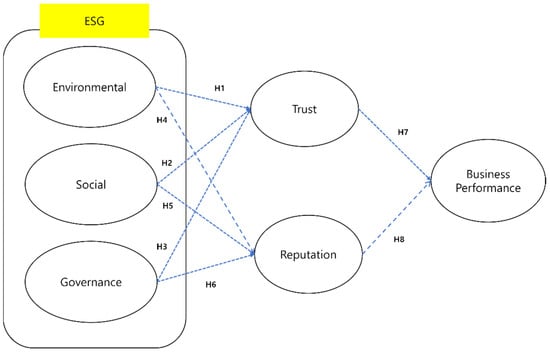 Recently, the principles of environment, social, and governance (ESG) have emerged as pivotal elements in global corporate management strategies. The ESG factors encompass the non-financial dimensions concerning social and environmental sustainability, which have become critical considerations for firms when evaluating investment decisions [1]. The concept of ESG has captivated the attention of both researchers and practitioners alike ever since its inception in 2006, notably with the publication of the UN principles of responsible investment [1,2]. From many literatures, ESG has evolved from the well-known concept of CSR [3,4,5,6] and the concept of ESG encompasses the three components of corporate social responsibility (CSR) [1,7]. It is closely aimed at generating positive societal impacts on social responsibility and sustainable development [1]. Recognizing ESG’s key indicators for assessing an organization’s value and sustainability, it is worthwhile to consider how organizations can enhance their reputation and trust through ESG management strategies [8,9]. Consequently, with a growing interest in ESG in Korea, government agencies and corporations are increasingly adopting ESG practices as part of their survival strategies [1].