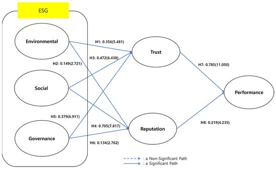 Especially, Investors and stakeholders often encounter the challenge of individually evaluating a firm’s sustainability, prompting reliance on ESG indicators for assessment [21,25]. Especially, engaging in ESG activities becomes a valuable tool for firms seeking competitive advantage [21]. The correlation between public organizations and business performance has long been acknowledged as pivotal for fostering social and organizational support [101]. According to [101,102], an organization’s business performance can be indirectly enhanced through the influence of trust. Trust reflects societal confidence in the government based on public sector operations, aligning with expectations [21,103,104].