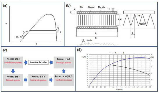 (a) Temperature entropy diagram of pump-driven separated heat pipe working fluid cycle; (b) schematic diagram of spoiler fin flat tube; (c) working fluid cycle flow sheet; (d) performance curve of centrifugal pump.