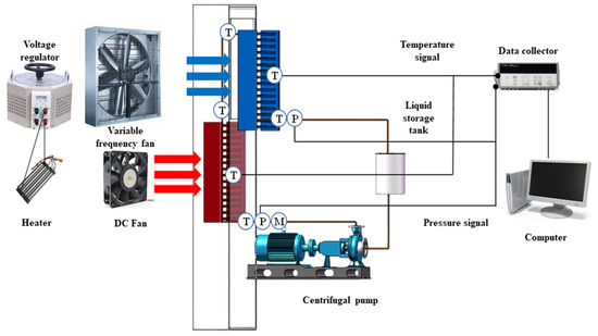 where Q is the designed heat-exchange capacity, kW; ρ is the density of the air on the heat exchanger side at a qualitative temperature, kg/m3; Cp is the constant pressure-specific heat capacity of the air on the heat exchanger side at a qualitative temperature, kJ/(kg k); the subscripts e and c represent the evaporator and condenser side parameters, respectively. According to Equation (1), the required air volumes for the evaporator and condenser sides are calculated as follows: