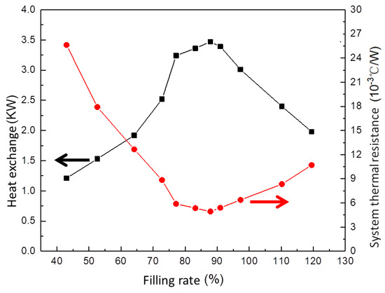 Curve of heat exchange and system thermal resistance changing with liquid filling rate.