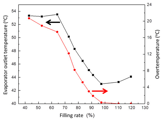 Curve of evaporator outlet temperature and superheat as a function of liquid filling rate.