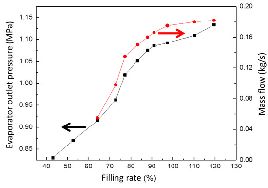 The curve of the outlet temperature and superheat of the evaporator as a function of the filling rate is shown in Figure 4. It can be seen that the overall outlet temperature and superheat of the evaporator show a gradually decreasing trend. When the filling rate is 43%, the superheat of the working fluid at the outlet of the evaporator is 20.7 °C. At this time, the working fluid inside the evaporator mainly undergoes a sensible heat exchange, while when the filling rate is 97.3%, the superheat of the working fluid at the outlet of the evaporator is 0.3 °C, indicating that the working fluid inside the evaporator mainly undergoes a phase change heat exchange. When the liquid filling rate continues to increase, the superheat is 0, indicating that the working fluid at the evaporator outlet is in a gas–liquid state of coexistence. The curve of the outlet pressure and mass flow rate of the evaporator changing with the filling rate is shown in Figure 5. It can be seen that the outlet pressure of the evaporator increases with the increase in the filling rate and the growth trend slows down. This is because the more the refrigerant filling rate increases, the greater the working fluid pressure in the heat pipe system. Besides, the pressure increase caused by the increase in the quality of gaseous working fluids is greater than that caused by the increase in the quality of the gas–liquid mixed working fluids. Therefore, when the outlet working fluid of the evaporator changes from gaseous to a two-phase fluid, the increase in the outlet pressure of the evaporator is slowed down.