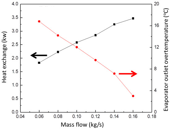 On the basis of standard operating conditions, we adjusted the opening of the vacuum fine tuning valve to control the local resistance coefficient and cross-sectional flow area at this location, so that the circulating mass flow rates of the pump-driven separated heat pipe system are 0.06 kg/s, 0.08 kg/s, 0.1 kg/s, 0.12 kg/s, 0.14 kg/s, and 0.16 kg/s, respectively. The relationship between the heat-exchange rate and the superheat degree of the working fluid at the outlet of the evaporator as a function of the mass flow rate is shown in Figure 6. It can be seen that the heat-exchange rate of the evaporator increases with the increase in the circulating mass flow rate. The relationship between the heat exchange (y) and mass flow rate (x) is expressed as y = 0.89 + 16.47x. Similarly, the relationship between the heat exchange (y) and mass flow rate (x) is expressed as y = 25.02 − 132.24x. The increase in the circulating flow rate leads to an increase in the flow resistance of each section in the heat pipe circuit, while the heat-transfer coefficient of the evaporation and condensation sections increases. For the rising and falling pipes, the increase in flow resistance leads to a decrease in the two-phase heat-transfer ratio of the evaporator and an increase in the subcooled heat-transfer ratio. For evaporators and condensers, the increase in flow resistance leads to an increase in heat transfer first and then a decrease in heat transfer. The increase in the heat-transfer coefficient in each phase leads to an increase in the heat-exchange rate, so the mass flow rate and heat-exchange rate is influenced by the comprehensive resistance of each section and the heat-transfer coefficient at the heat exchanger. The superheat is used to evaluate the heat-transfer performance of the evaporator. When the mass flow rate is low, the superheat at the outlet of the evaporator is high, and when the overheated steam heat-exchange section is longer, the average heat-transfer coefficient on the refrigerant side inside the evaporator is lower. When the mass flow rate is high, the degree of superheat is very small, indicating that the undercooling and two-phase heat-transfer sections are longer, and the average heat-transfer coefficient on the refrigerant side is higher. The superheat at the outlet of the evaporator decreases with the increase in the mass flow rate. When the mass flow rate is 0.06 kg/s, the superheat at the outlet of the evaporator is 16.8 °C. At this time, the superheated steam heat-exchange section is longer, and the average heat-transfer coefficient on the refrigerant side inside the evaporator is lower; at a mass flow rate of 0.16 kg/s, the superheat degree is 3.0 °C, indicating that the undercooling and two-phase heat-transfer sections are longer at this time, and the average heat-transfer coefficient on the refrigerant side is higher. However, an excessive heat flow no longer increases the heat-transfer performance after saturating the pressure inside the evaporator and may even cause a blockage of the working fluid circulation due to overheating.
