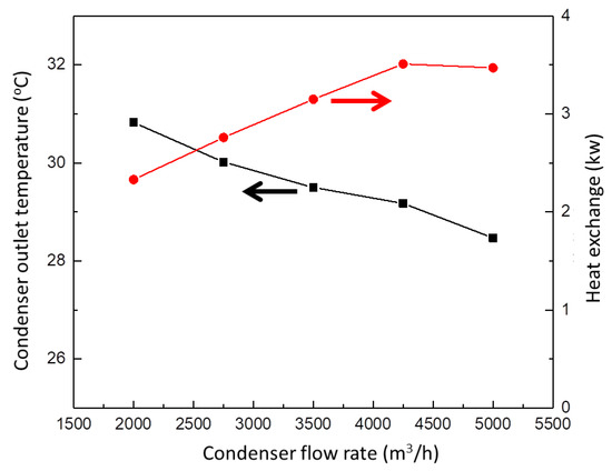 On the basis of standard operating conditions, the air volume of the condenser side fan is controlled through a frequency converter, and the QDF-6 hot ball anemometer is used to test the actual air volume. Experiments are conducted on five operating conditions: 2000 m3/h, 2750 m3/h, 3500 m3/h, 4250 m3/h, and 5000 m3/h. The relationship between the temperature of the condenser outlet air and the heat-exchange rate with the condensing air flow rate is shown in Figure 7. It can be seen that the heat-exchange rate of the heat pipe system initially increases with the increase in the condensing air flow rate, but there is a slight decrease at 4250–5000 m3/h where the condensing air flow rate is relatively high. This is because the increase in air flow rate increases the heat-exchange rate when there is a sufficient heat exchange between the air and the heat exchanger. In the case of an excessive air flow, the contact time between the air and the condenser is short, and the heat exchange cannot be fully carried out, resulting in a decrease in heat exchange. The outlet air temperature of the condenser decreases with the increase in condensing air volume because the time for heat exchange between the unit mass air and the condenser decreases with the increase in the condensing air volume.