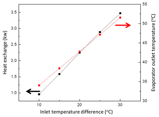 On the basis of standard operating conditions, the indoor temperature is changed to regulate the temperature difference between the air inlet of the evaporator and condenser. Experiments are conducted on five operating conditions: 55 °C, 50 °C, 45 °C, 40 °C, and 35 °C. If the inlet air temperature on the condenser side is 25 °C, the inlet air temperature difference under the five operating conditions is 30 °C, 25 °C, 20 °C, 15 °C, and 10 °C, respectively. The relationship between the heat-transfer capacity of the heat pipe system and the outlet temperature of the evaporator as a function of the inlet air temperature difference is shown in Figure 8. When the inlet air temperature difference between the evaporator and condenser is 10 °C, the heat-transfer capacity of the heat pipe system is 0.96 kW, while when the temperature difference is 30 °C, the heat-transfer capacity is 3.47 kW, increasing by 261.5%. It can be seen that improving the indoor and outdoor temperature difference has a significant effect on the heat-transfer performance of the separated heat pipe. The heat-exchange rate basically shows a linear relationship with the temperature difference of the inlet air because there is no phase change in the air, and in this case, the heat-exchange rate is directly proportional to the temperature difference of the heat exchange.