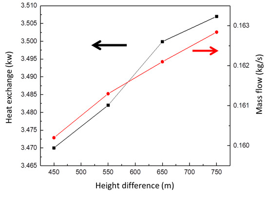 On the basis of standard working conditions, the installation position of the condenser was raised by building a bracket, and four working conditions were set for the experiment: 450 mm, 550 mm, 650 mm, and 750 mm height differences were set between the evaporator and condenser. The relationship between the heat-exchange rate and circulating flow rate of the heat pipe system and the height difference between the two devices is shown in Figure 9. It can be seen that as the height difference increases, the heat-transfer and mass flow rate of the pump-driven separated heat pipe increase slightly. When the height difference changes from 450 mm to 750 mm, the increments of the heat-transfer and mass flow rate are 1.07% and 1.65%, respectively. This situation is consistent with the simulation results. This is because for pump-driven separated heat pipes, the circulating power is jointly provided by the pump and gravity, and its calculation formula is as follows: