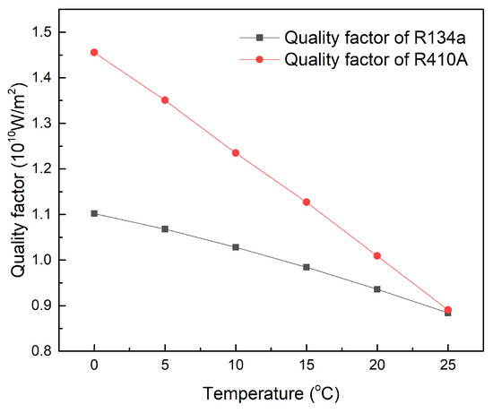σ is the surface tension of the working medium, N/m; ρl is the density of the liquid working fluid, kg/m3; μL is the dynamic viscosity of the liquid working fluid, Pa·s; hfg is the latent heat of vaporization of the working fluid, J/kg. The quality factors of R134a and R410A between operating temperatures of 0–25 °C are shown in Figure 10. Within the temperature range of 0–25 °C, the quality factor of R410A is higher than that of R134a, indicating that R410A has superior heat-transfer and flow performance compared to R134a within this temperature range.