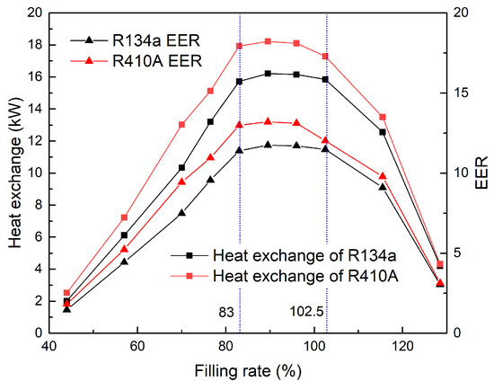where Q is the heat-exchange capacity of the heat pipe system, kW; Win is the input power of the system, kW; Pfan,e, Pfan,c, and Ppump, respectively, represent the energy consumption of the evaporator side small fan, condenser side fan, and centrifugal pump, W. The changes in the heat transfer and energy efficiency ratio (EER) of the two working fluids with the filling rate are shown in Figure 11. The optimal filling rate range for both working fluids is 83~102.5%. Within each filling rate range, the heat transfer of the heat pipe system when using R410A working fluid is higher than that when using R134a, with an increase of 2.8~26%. As the filling rate increases, this proportion gradually decreases, and the filling rate is in the lower range of 44~83%. The heat-exchange rate of R410A is 14.5~26% higher than that of R134a. Within the optimal filling rate range of 83~102.5%, R410A has a 9.1~14% higher heat-exchange rate than R134a; however, in the range of 102.5% to 128.5% with a high liquid filling rate, R410A has only 2.9% to 7.6% more heat exchange than R134a. This is because within the lower liquid filling rate range, the working fluid rapidly vaporizes in the evaporation section and approaches the inlet temperature of the evaporator side at the outlet. For R410A, the difference in specific enthalpy between the gas working fluid with a higher temperature and the liquid working fluid with a lower temperature is higher than R134a. As the filling rate increases, the growth value of the working fluid temperature decreases, the difference in specific enthalpy correspondingly decreases, and the relative difference in heat transfer decreases. Due to the constant input power Win of the system, the trend of changes and comparisons in the EER of the two working fluids is the same as that of the heat exchange. Within the optimal filling rate range, the maximum EER values of R410A and R134a reached 11.74 and 13.20, respectively.