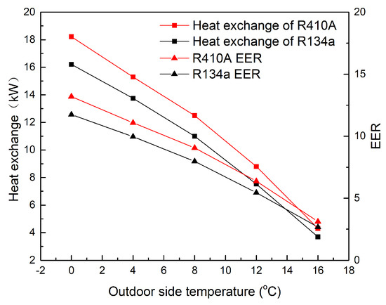 Keeping the indoor temperature constant at 25 °C, the trend of the heat transfer and EER of the two working fluids with the change of the outdoor temperature is shown in Figure 4 and Figure 5. As the outdoor air temperature increases, the temperature difference between the hot and cold ends of the heat exchanger decreases and the temperature difference between the air and refrigerant in the condenser also decreases. The subcooling of the working fluid at the outlet of the condenser decreases, while the phase change of the working fluid decreases. The proportion of the latent heat transfer with the higher heat-transfer efficiency decreases, and the proportion of the sensible heat transfer increases. The heat exchange rate decreases, and as the temperature difference decreases, the trend of decreasing heat exchange gradually increases; the main reason for the decrease in the heat exchange is the shift from a decrease in undercooling to a decrease in the proportion of working fluids for the latent heat exchange. When the outdoor temperature increases from 0 °C to 16 °C, the indoor and outdoor temperature difference decreases from 25 °C to 9 °C, the heat transfer of R410A decreases from 18.22 kW to 4.3 kW, and the EER decreases from 13.20 to 3.11, with a decrease of 76.4%; the heat-exchange rate of R134a decreases from 16.21 kW to 3.69 kW, and the EER decreases from 11.74 to 2.67, with a decrease of 77.2%. It can be seen from Figure 12 that as a refrigerant, R410A has a better heat-transfer performance when applied to the separated heat pipe system in this paper when the outdoor temperature is below 15 °C. The heat transfer and EER obtained by applying R410A to the heat pipe are fitted with the change in outdoor temperature. When the indoor temperature is 25 °C, the function equation of the heat transfer and EER of the pump-driven separated heat pipe system with the change in outdoor temperature is as follows: