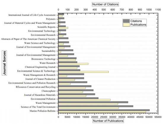 According to the analysis results, Web of Science showed the top 10 relevant journals in terms of the number of publications (Figure 3): Marine Pollution Bulletin (1007), Science of The Total Environment (825), Waste Management (769), Environmental Pollution (441), Journal of Hazardous Materials (404), Chemosphere (386), Resources Conservation and Recycling (363), Environmental Science and Pollution Research (317), Journal of Cleaner Production (282), and Waste Management Research (282). With citation records are as follows: Marine Pollution Bulletin (48,278), Science of The Total Environment (33,328), Waste Management (32,837), Environmental Pollution (28,701), Journal of Hazardous Materials (15,279), Chemosphere (13,508), Resources Conservation and Recycling (15,010), Environmental Science and Pollution Research (6616), Journal of Cleaner Production (9025), and Waste Management Research (4713). All numbers are presented in terms of their high quality against the impact of the number of citations in each journal. According to Swain [31], engaging in a bibliometric analysis of a specific journal provides a detailed portrayal of the journal, offering valuable insights that surpass superficial observations. This analysis allows us to uncover the journal’s quality, progress, and productivity in a specific field, country, or region.