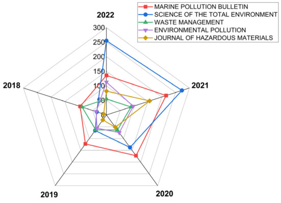 Figure 4 illustrates the progression of the top five journals in terms of both publication counts and global citations over five years. The number of citations is more significant than publications because they provide a quantifiable measure of a researcher’s influence, whereas the number of articles published reflects their productivity [32,33]. Notably, the Science of the Total Environment journal has experienced a significant increase in publications from 2018 to 2022, with the highest number of publications reaching 255 papers in 2021. The Marine Pollution Bulletin journal holds the record for the most publications from 1992 to 2022, totaling 1007 publications. In the past five years, it has published the highest number of papers in 2021, with 216 publications. The Waste Management journal, also contributed significantly in 2021 with 89 publications, whereas the Hazardous Materials journal ranked high with 156 publications in the same year. Surprisingly, the Environmental Pollution journal emerged as the leading journal in terms of publication count, publishing the most papers in 2022 with 113 publications.