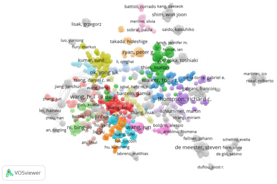 Returning to the most cited publications, Geyer et al. [3] emphasized the significance of addressing the expanding plastic waste crisis, encompassing both landfills and natural environments, and underscored the extensive environmental repercussions, particularly the proliferation of microplastics in oceans and ecosystems. Similarly, Jambeck and Wright investigated the adverse environmental effects of plastic pollution, with a specific focus on the detrimental presence of microplastics in marine ecosystems [38,48]. These studies advocate and influence enhanced waste management practices and preventative measures, underscoring the need for interdisciplinary collaboration to formulate comprehensive solutions for plastic waste management and the protection of marine environments.