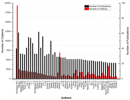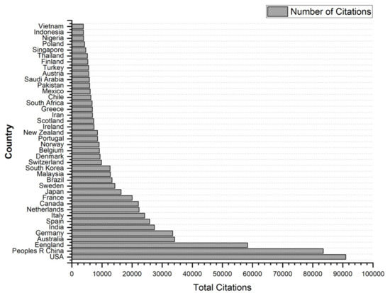 Figure 7 shows the citation numbers reveal where the USA takes the lead with 91,003 citations, closely followed by China with 83,506 citations. England secures the third position with 58,400 citations, while Australia and Germany have 34,147 and 33,493 citations, respectively. India and Spain also demonstrate significant citation numbers with 27,424 and 25,840 citations, respectively. Italy, the Netherlands, and Canada have citation counts of 24,207, 22,338, and 22,120, respectively. France, Japan, Sweden, Brazil, Malaysia, and South Korea follow with citation numbers ranging from 20,030 to 12,728. Switzerland, Denmark, Belgium, and Norway complete the list with citation counts of 9825, 9400, 9131, and 9059, respectively. From the number of publications produced, China produced 2503 publications by 2022, the United States amounted to 1639, in the second position, and India occupied the third position with 1069 publications; these three countries produced more than 1000 publications each. Meanwhile, de Sousa [36] provided different results where China was the most influential country in Scopus with 639 publications related to plastic waste management while the United States was ranked third with 392 publications after India (431 publications), and the most cited country was the United Kingdom with 1124 citation numbers. The development of countries’ scholarly output, the top 50 authorship networks, and the number of citations of the top 20 countries can also be seen in Figure 8.
