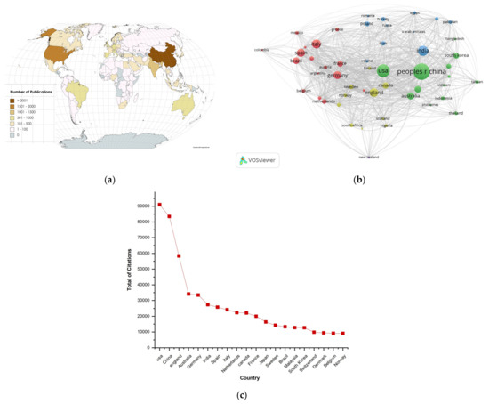 (a) Country’s scholarly output; (b) Co-authorship country network among the top 50 cited countries; and (c) Country and citations.