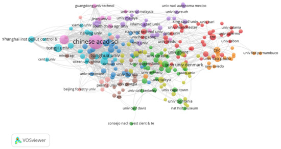 Citations provide evidence of the extent to which other scholars have incorporated the researcher’s work into their investigations, illustrating their influence and utilization within the academic community. A large number of citations indicate that the researcher’s contribution has had a major impact on the field and has been widely accepted among peers. This recognition positions the researcher as a leading figure in the field, confirming the exceptional quality of their work. In Figure 9, VOSviewer visualizes the interrelation among affiliations by highlighting their contributions to the plastic waste management study. In addition, publications also serve as a metric of research productivity, indicating the quantity of work produced. However, it is important to note that the number of publications alone does not necessarily indicate the inherent quality of the research. To comprehensively assess scientific contributions, it is imperative to consider the relationship between authors, journals, affiliations, and countries, as these factors contribute to the broader academic landscape and collaboration networks, which in turn influence the visibility and impact of research results.