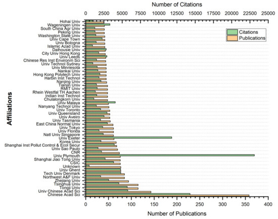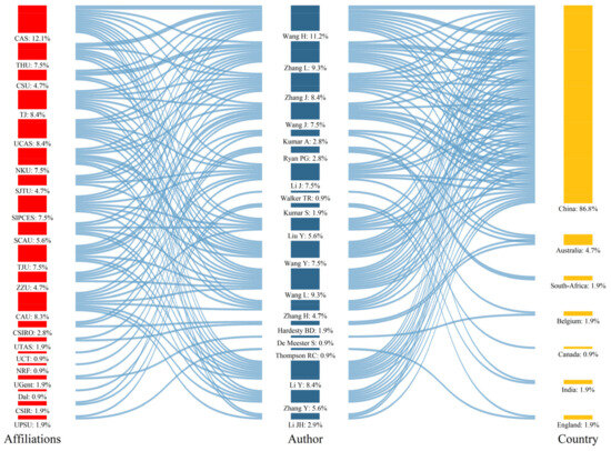Figure 10 shows the citation records for the affiliations are as follows: the University of Plymouth has a citation count of 23,113, while the University of Exeter has 11,785 citations. The University of Georgia closely follows 11,703 citations, while North Carolina State University has a citation count of 10,186. On the other side, the publication records for the affiliations are as follows: Chinese Academy of Sciences has 501 publications, while both Tongji University and Tsinghua University have 115 publications each. Zhejiang University follows closely with 94 publications, and both Northwest A&F University and the Technical University of Denmark have 85 publications each. The University of Ghent and the Spanish National Research Council (CSIC) have 77 and 76 publications, respectively. Shanghai Jiao Tong University and the University of Plymouth also have 76 publications each. Overall, the correlation between the top 20 affiliations with the top 9 authors and top 7 countries can be seen in Figure 11.