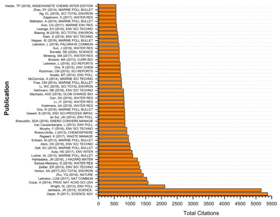 The studies of Geyer, Jambeck, and Wright are the three most cited publications related to plastic waste management in the Web of Science. Furthermore, Figure 12 shows the top 50 related publications, organized by their citation counts over the past decade. It turned out that the influence of a publication can indeed be effectively quantified by its citation frequency, thus rendering citation analysis a valuable tool for assessing a publication’s significance and utility. Moreover, it serves as a foundation for policymaking and the development of sustainable systems in the realm of plastic waste management [40,41].