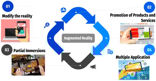 The high acceptance in the implementation process of augmented reality consists of the fact that this technology does not require any additional device to take advantage of it, which has allowed its wide application, unlike virtual and mixed reality. Precisely due to all these benefits, AR has been widely used in different sectors such as health, education, commerce, tourism, real estate, marketing, and the entertainment industry, among others. This technology has found its niche of action in those scenarios where it is necessary to have a series of instructions to carry out a specific task, guide users within a specific place, show a product or service that you want to offer, expand information about a service, or observe the completion of a product or service during its initial phases, among many other options, as shown in Figure 1.