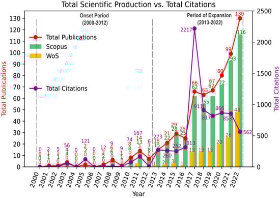 In the quantification of scientific data, we employ scientometrics, a tool that allows us, in this context, to identify relevant factors such as author relationships, citation networks, and annual production. Of the most common approaches for conducting this type of analysis, we highlight citation-based analysis [68], collaboration network analysis [69], and those grounded in an intellectual structure [70].