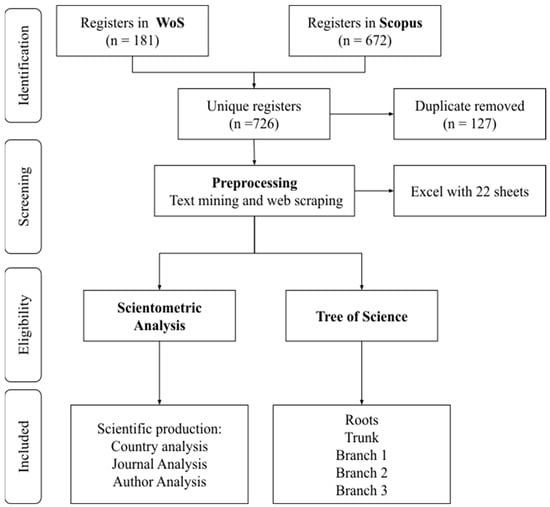 To achieve this goal, we have focused our attention on using search equations in prominent academic databases, such as WoS and Scopus, to gather highly relevant data for conducting a comprehensive analysis. Once the data were obtained, we proceeded to carry out a meticulous duplicate removal process to ensure the quality and integrity of the collected information. Subsequently, we applied the innovative “tree of science” (ToS) approach to our analysis. This tool, supported by the Tosr R application (available at https://cran.r-project.org/web/packages/tosr/index.html, accessed on 20 September 2023), allowed us to delve deeply into the contributions made over time in this field. Furthermore, we conducted a thorough scientometric analysis to unravel the various components that give this topic its global relevance. This multidimensional approach provides us with a comprehensive and detailed view of the evolution and impact of research in this area.
