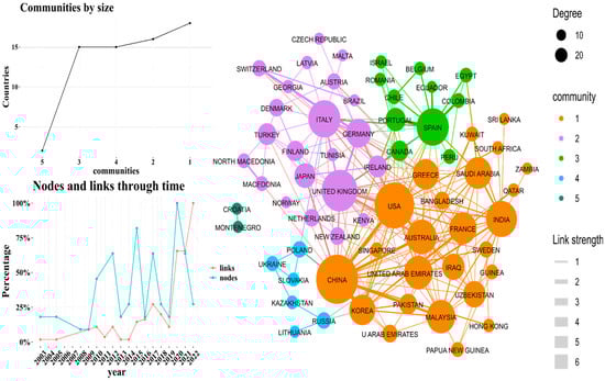 Regarding collaboration communities between countries, five research communities can be identified, as shown in Figure 5. The first one (orange) is led by close research collaborations between China and the USA, featuring various works like those by author Choi [82], focusing on a relevant topic for tourism and augmented reality. The study concentrates on energy consumption optimization in buildings, which has a significant impact on the tourist destinations and visitor experiences. The article addresses this issue through the analysis and visualization of energy consumption data integrated with Building Information Models (BIM). This integration allows for a deeper and more detailed understanding of the energy performance of tourist buildings, potentially leading to more effective energy conservation strategies. Augmented reality comes into play when considering how these energy consumption data visualizations could be innovatively presented to visitors and tourists.