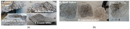 Within the scope of this experimental program, five concrete mixes with different aggregate types are tested, namely I. Gravel 0/16, II. Gravel 0/32, III. Basalt 0/16, IV. Limestone 0/16, and V. Gravel 0/8 with steel fibres with hooked-end and length of L = 35 mm, diameter d = 0.75 mm, and tensile strength 1200 MPa. The concrete mix of the corresponding concrete batches is designed according to EN 206 [22] and is reported in Table 1, along with details of the aggregate types.