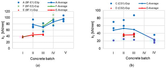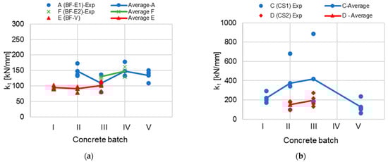 The results of the initial stiffness values in relation to the concrete batch are shown in Figure 6. Based on the results, it can be concluded that for the bonded anchors with the three different adhesive agents (A, E, and F) the mean value of the initial stiffness can be approximated as almost constant (see Figure 6a). The same conclusion can also be made for the expansion anchor B, as shown in Figure 6c.