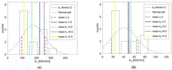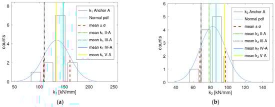 Figure 10, Figure 11 and Figure 12 show the comparison of the individual k mean values for the different bonded anchor types installed in different concrete mixes with the statistics derived from all individual k1 and k2 values for each anchor type regardless of the concrete batch. For all different anchor types, the mean k1,2 values obtained from the tests in different concrete mixes are found to be inside the interval , where are the mean values of k1 or k2 calculated from all the different tests for each anchor type, and the corresponding standard deviation. That is expected since the total dataset comprises the individual datasets. Nevertheless, none of the individual dataset means are found to be outside the interval , which represents 66% of the observations of a normal distribution. Thus, none of the individual means of both k1 and k2 can be considered as extreme values. Therefore, a constant mean stiffness k1 and k2 can be assumed for the given anchor types and geometries and for the different concrete types. Note that the datasets for each series contained enough points for a statistical analysis. The number of tests per series was between three and four repetitions.